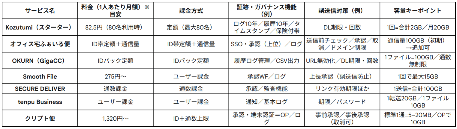 各サービスにはそれぞれ異なる強みがあります。 送信件数が多いなら定額のサービスが、大容量ファイルを扱うなら容量上限が高いサービスが適しているでしょう。